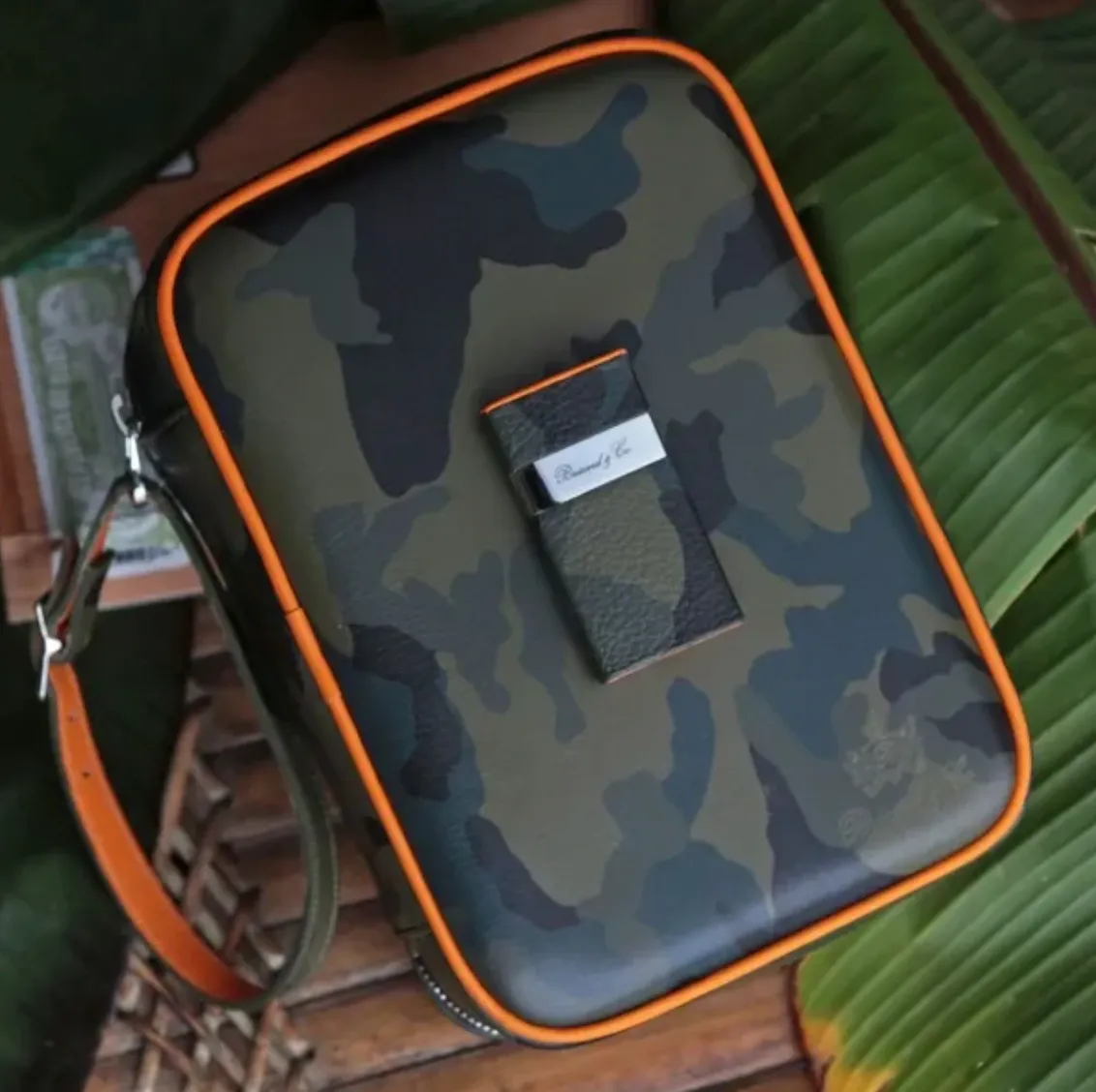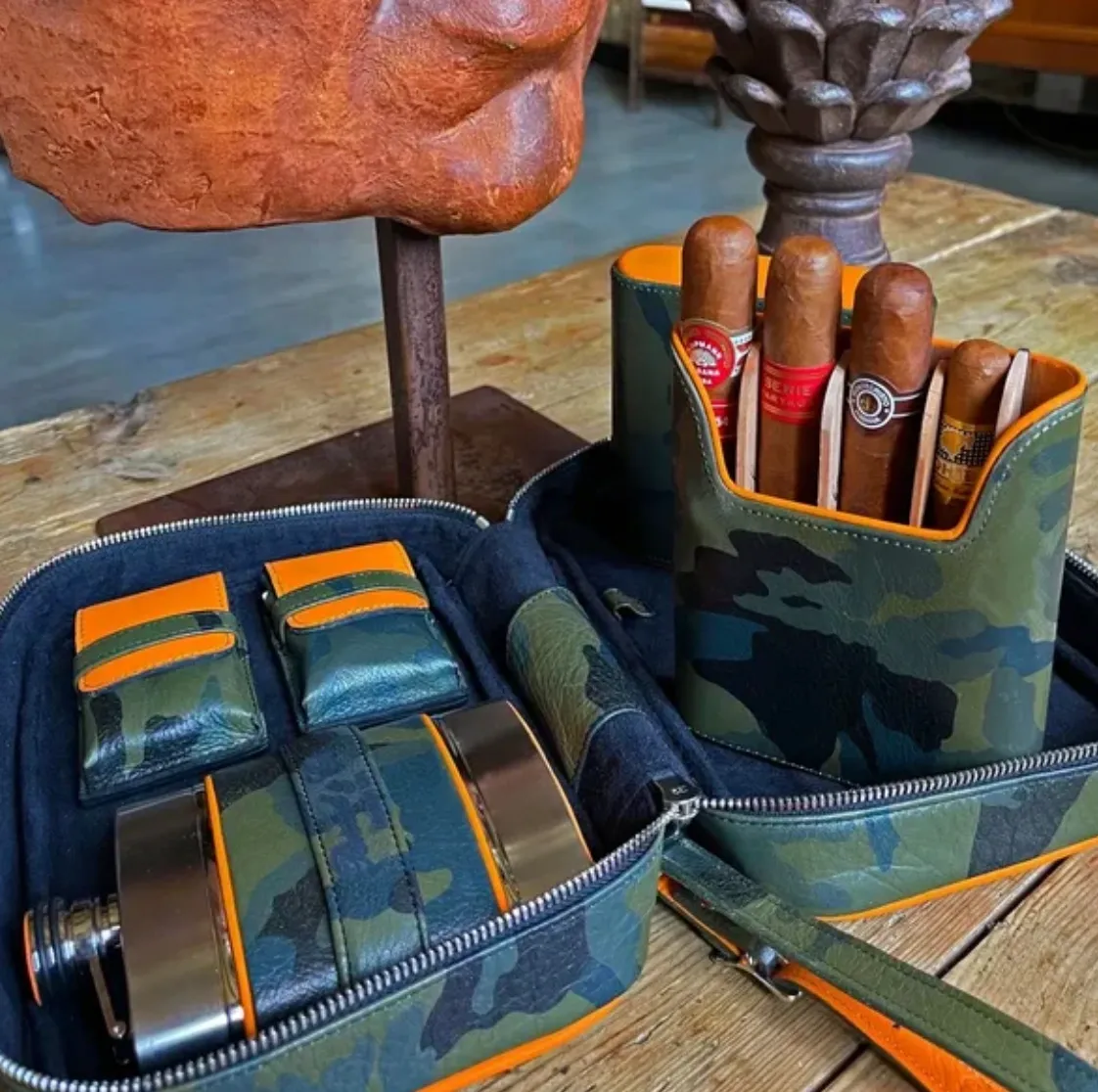 Connected via magnetic system, the cigar case, lighter and cutter pouches are removable, while the flask fits in a snug leather pocket that can be used to hold a cell phone, wallet or eye wear.