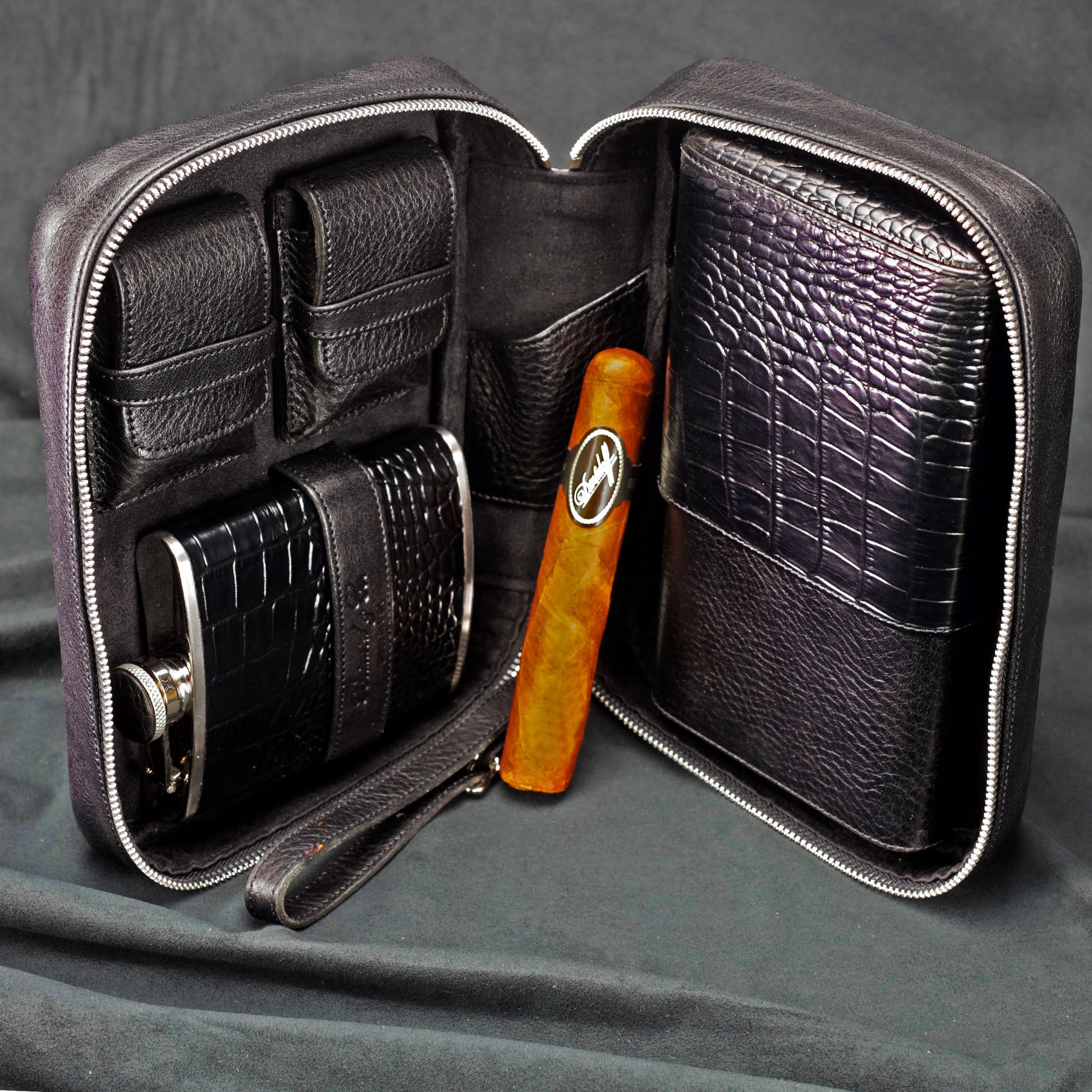 The Havana Traveler is the most luxurious compendium for the cigar aficionado on the go. Crafted of the finest top grain leather, it opens to unveil a suede lined compartment. The Havana Traveler comes with the following products: