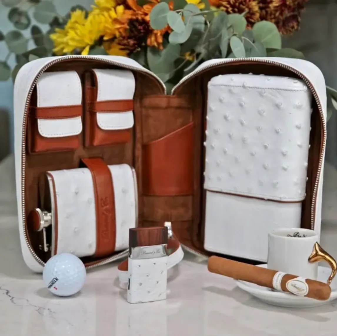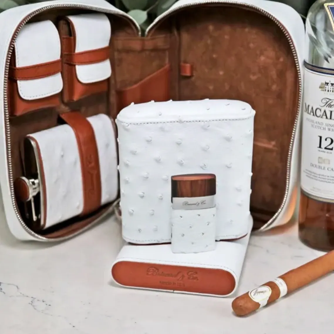 The Havana Traveler is the most luxurious compendium for the cigar aficionado on the go. Crafted of the finest top grain leather, it opens to unveil a suede lined compartment. The Havana Traveler comes with the following products: