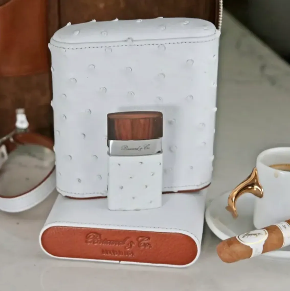 Connected via magnetic system, the cigar case, lighter and cutter pouches are removable, while the flask fits in a snug leather pocket that can be used to hold a cell phone, wallet or eye wear.