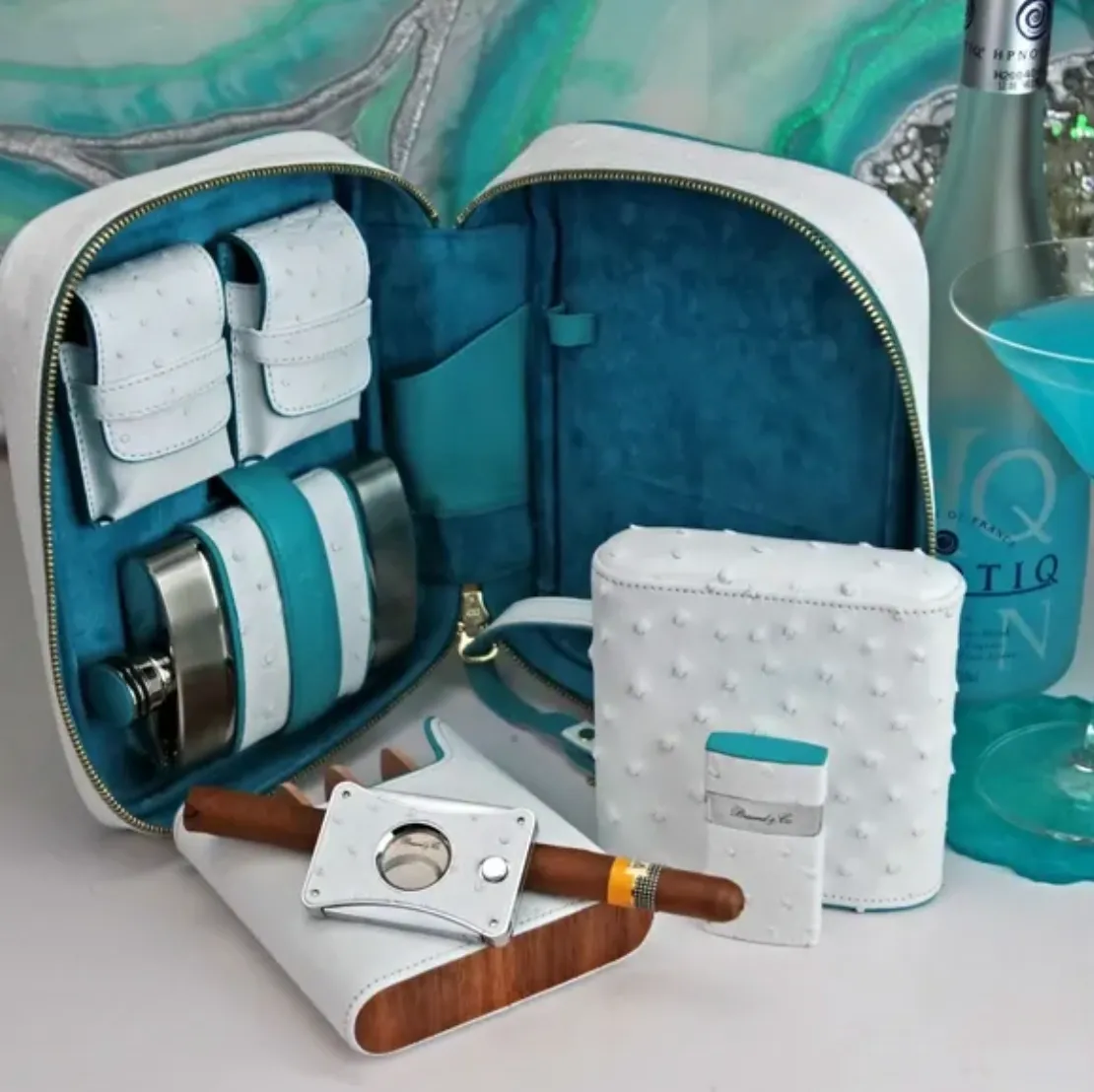The Havana Traveler is the most luxurious compendium for the cigar aficionado on the go. Crafted of the finest top grain leather, it opens to unveil a suede lined compartment. The Havana Traveler comes with the following products: