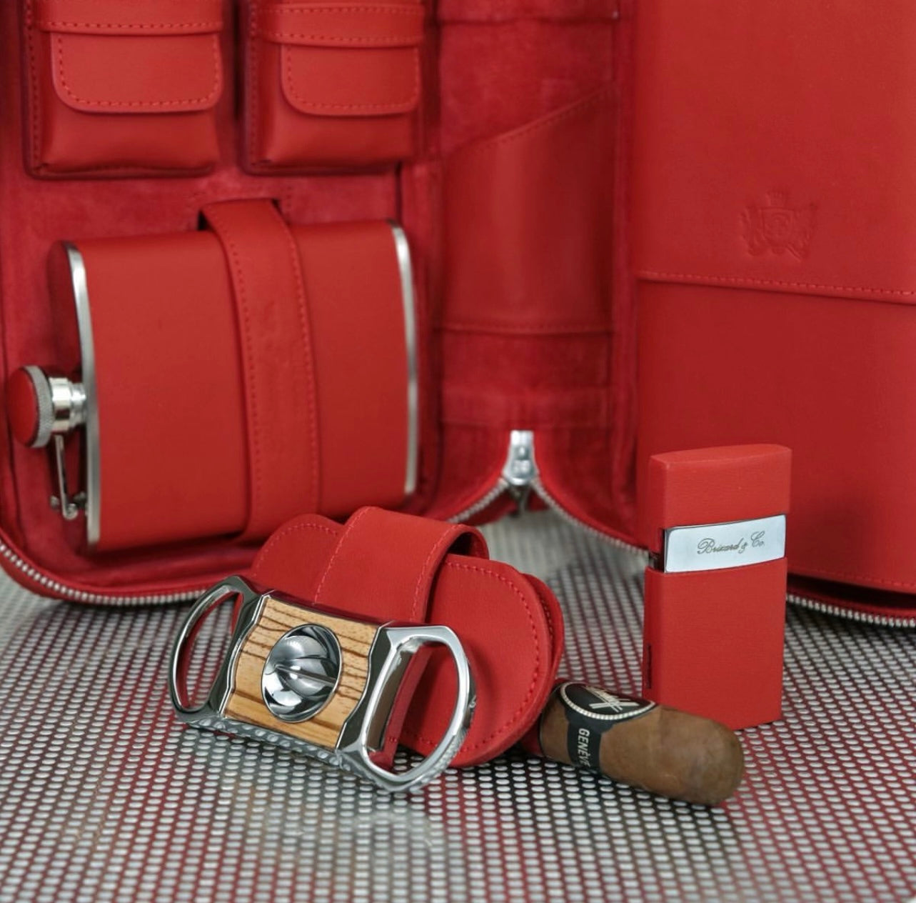 Connected via magnetic system, the cigar case, lighter and cutter pouches are removable, while the flask fits in a snug leather pocket that can be used to hold a cell phone, wallet or eye wear.