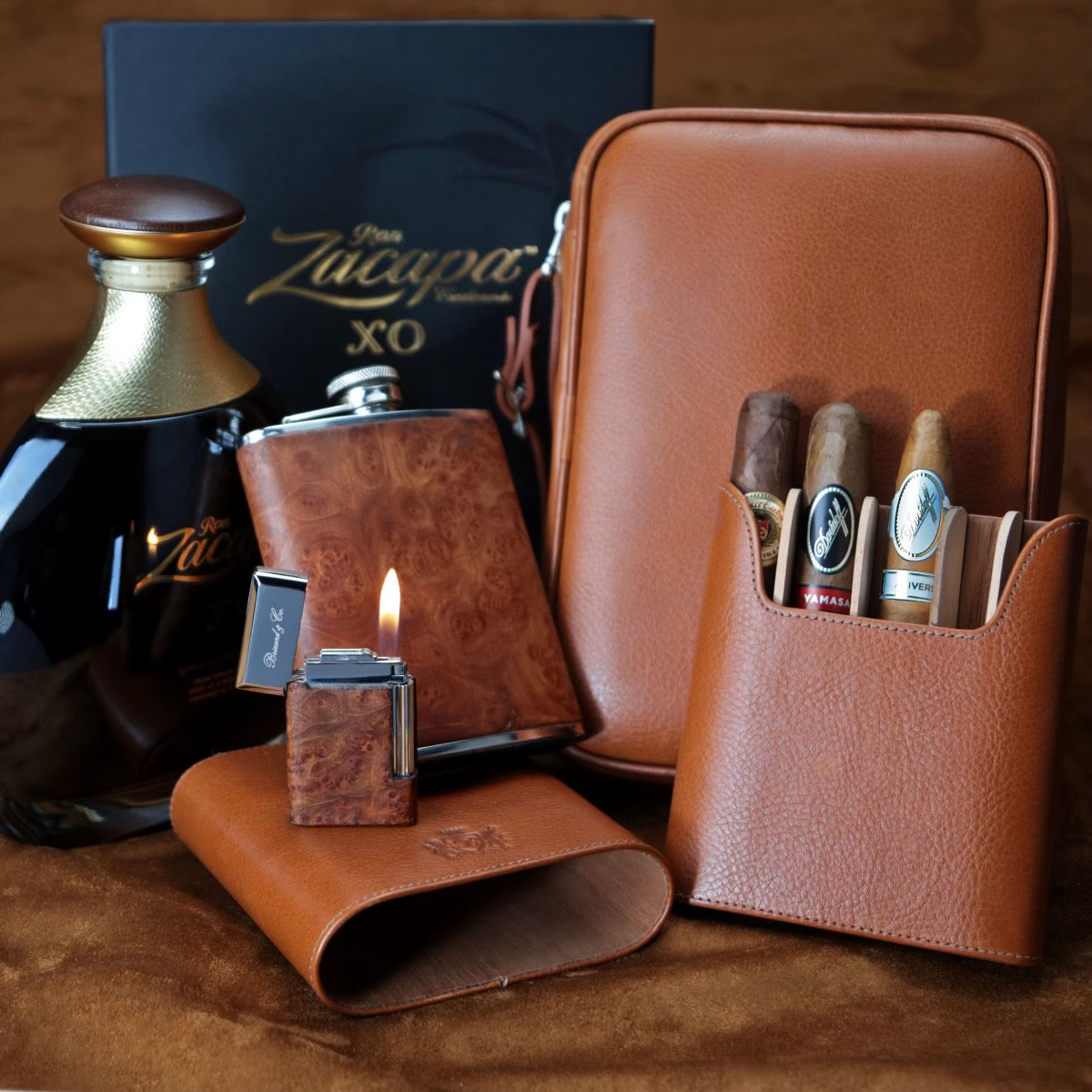 Connected via magnetic system, the cigar case, lighter and cutter pouches are removable, while the flask fits in a snug leather pocket that can be used to hold a cell phone, wallet or eye wear.