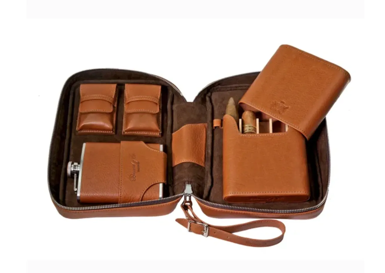 The Havana Traveler is the most luxurious compendium for the cigar aficionado on the go. Crafted of the finest top grain leather, it opens to unveil a suede lined compartment. The Havana Traveler comes with the following products: