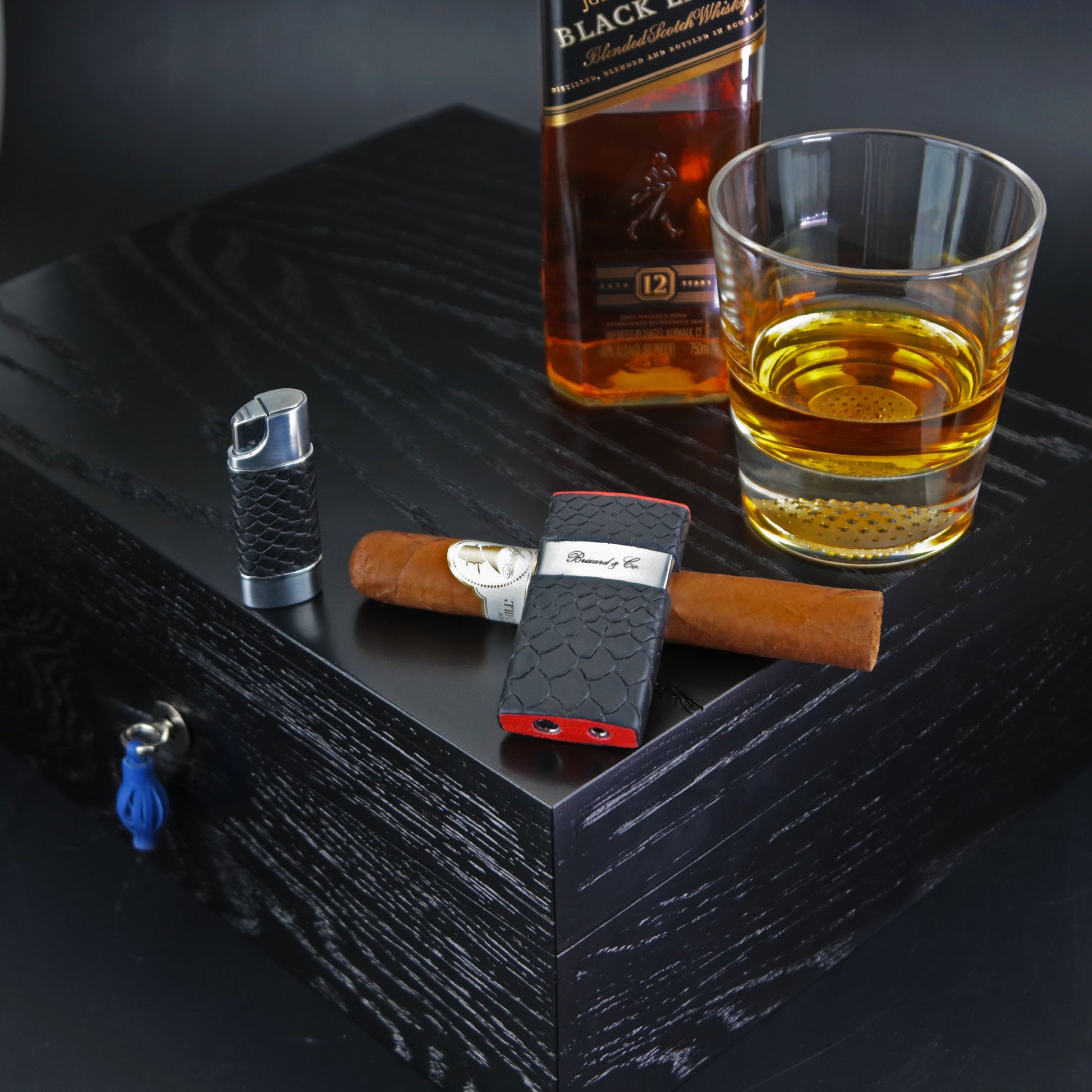 Made from solid oak wood logs, finished in beautiful black lacquer, yet showcasing all the natural beauty of the wood grain. Bottom fully covered with full grain leather. Our Royal Oak Collection humidors are fully designed to be humidified with Boveda humidification system. Boveda humidity packs are the most precise to regulate and maintain correct humidity atmosphere and are endorsed by most reputable tobacconist and cigar brands . They include low profile receptacle, specially made for the Boveda packs out of solid cedar with an inlaid aluminum screen and connect to the lid of your humidor via magnets.