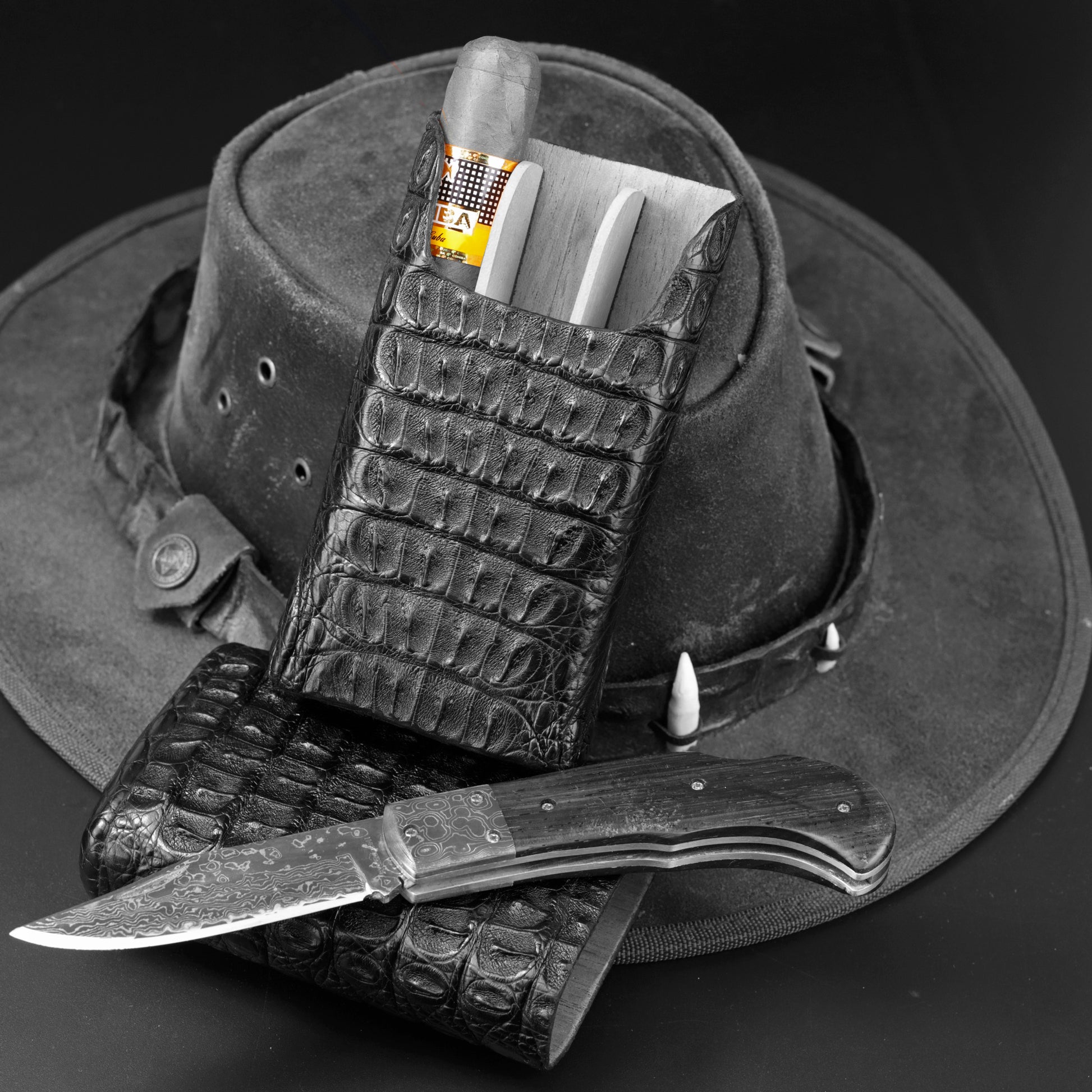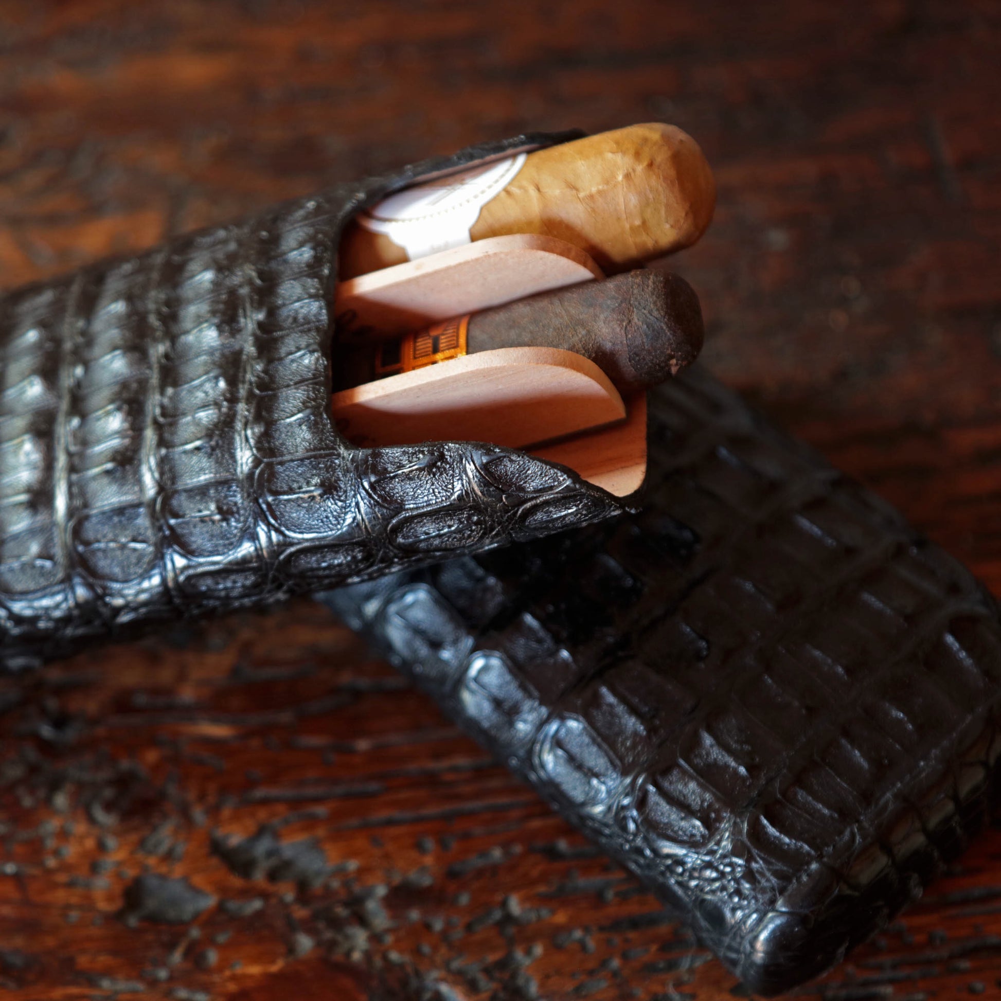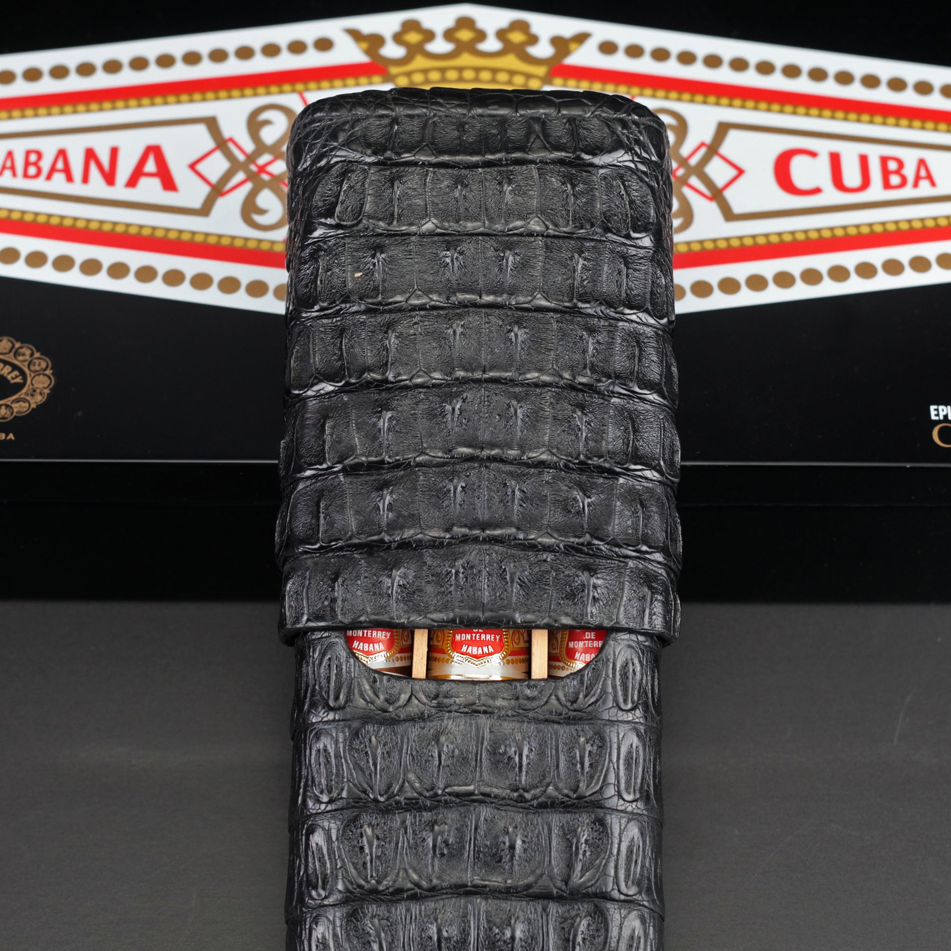 The "Show Band" 3 Cigar Case - Genuine Black Caiman Alligator
