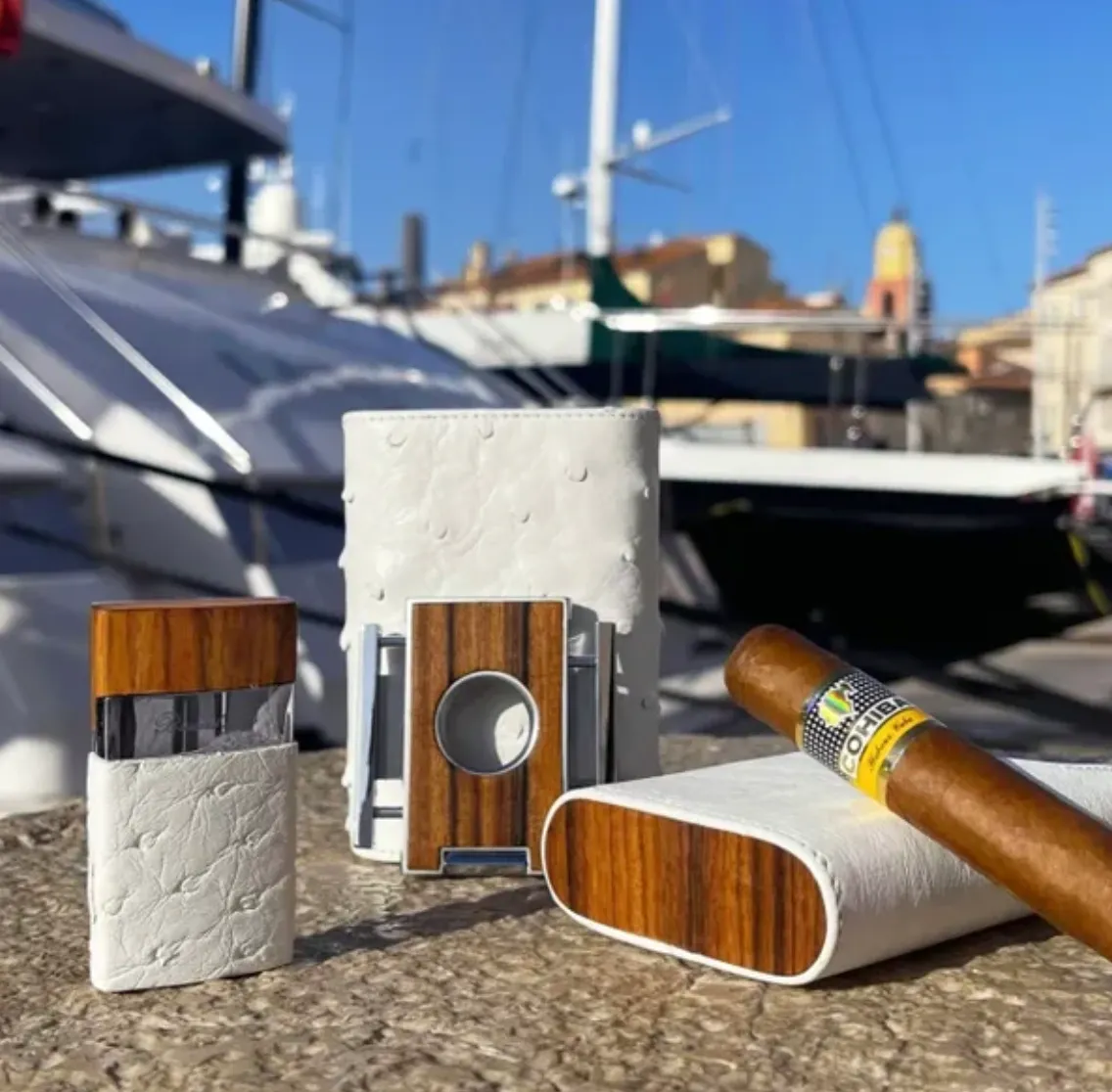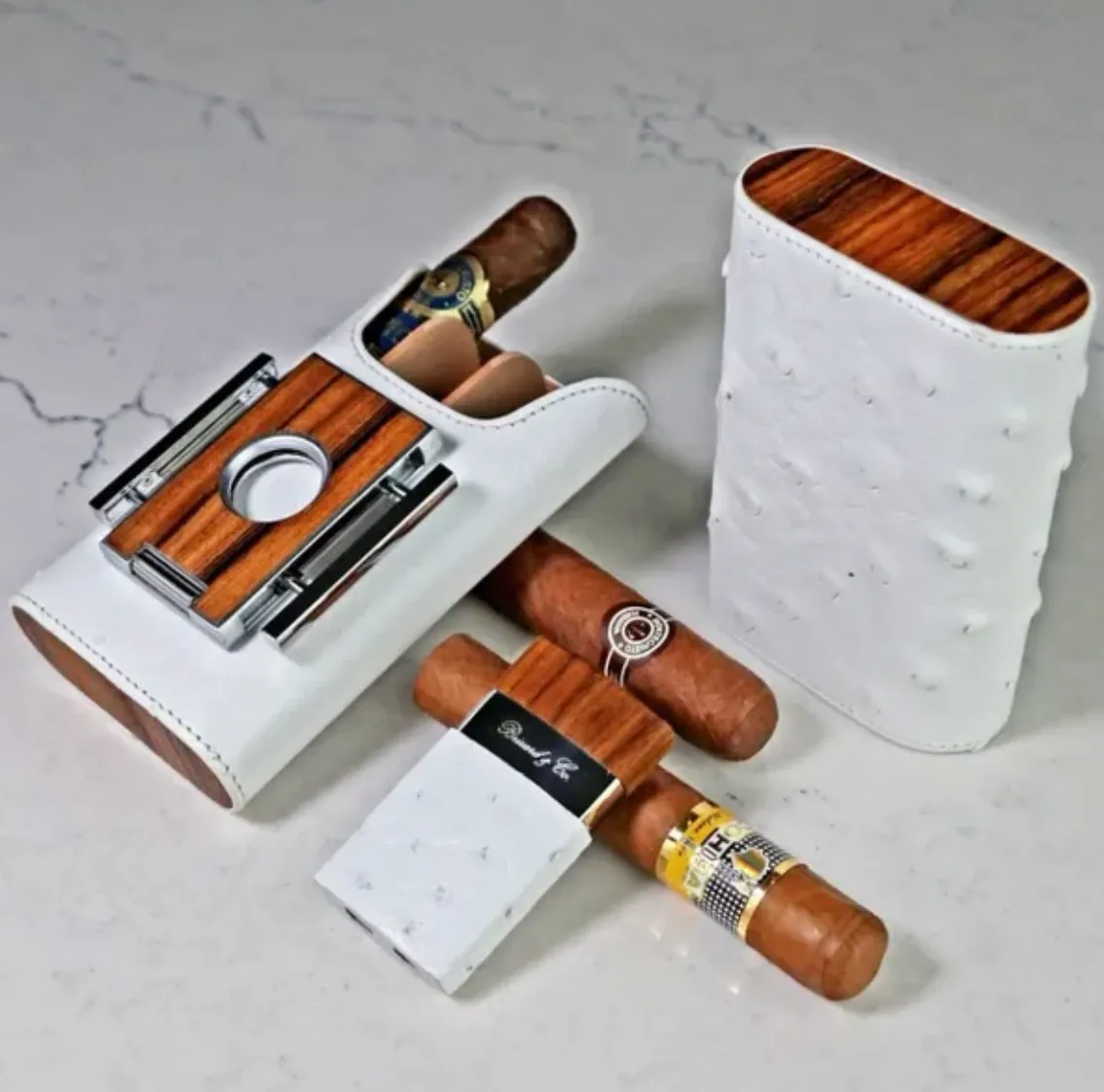The "Show Band" 3 Cigar Case - White Ostrich Leather and Rosewood