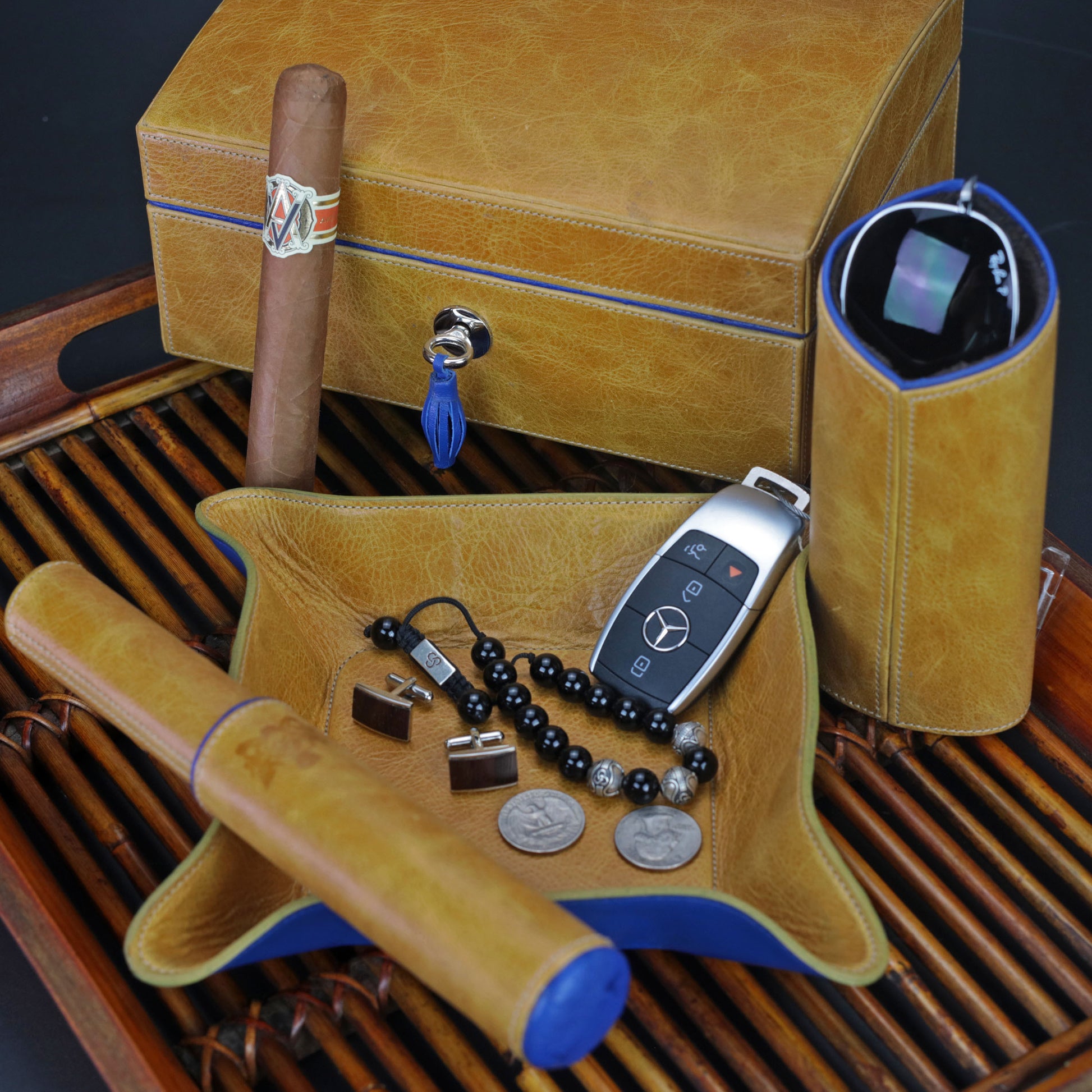 The Single Cigar Tube - Blue Ostrich and Camel Color Leather