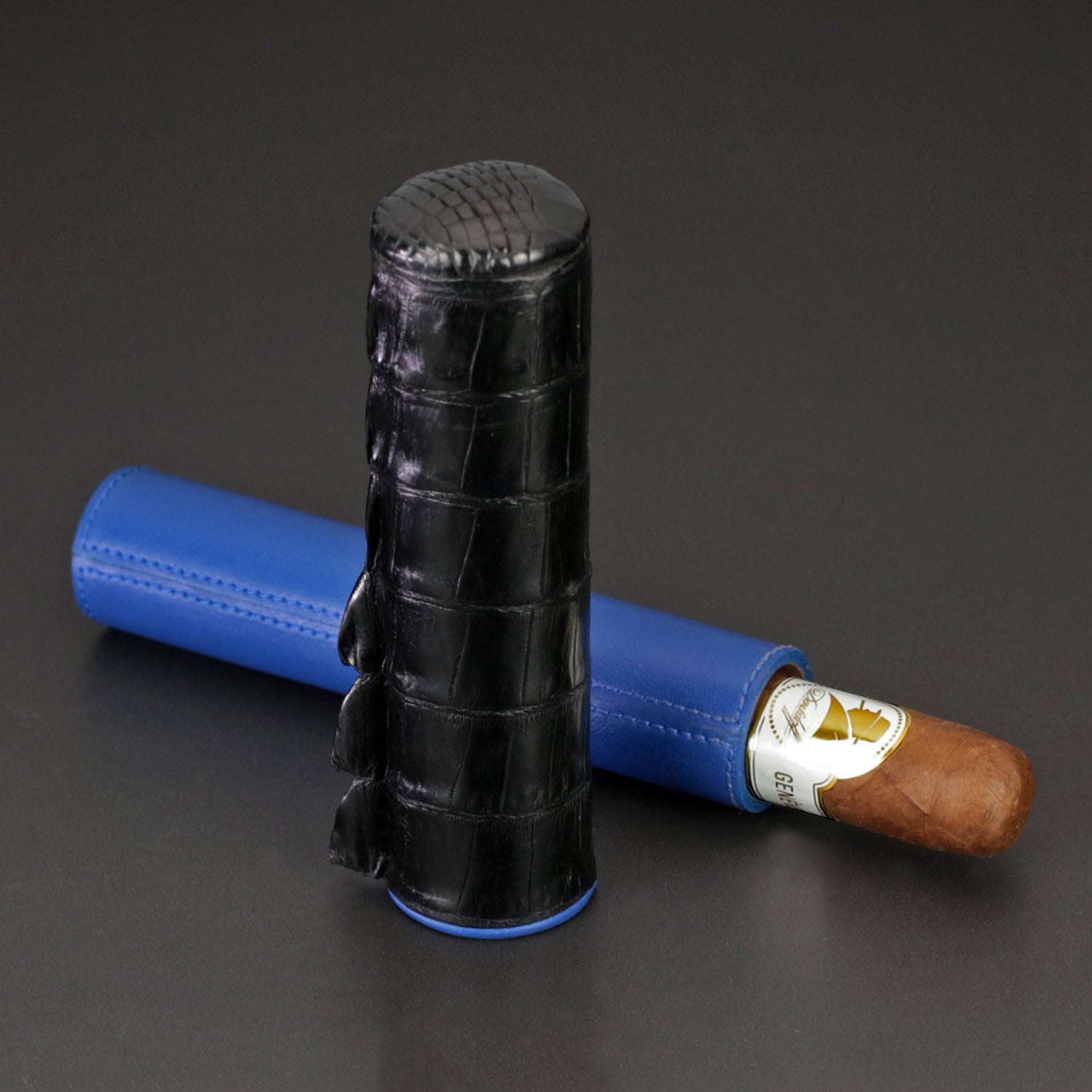 The Single Cigar Tube - Genuine Black Caiman Alligator and Blue Leather
